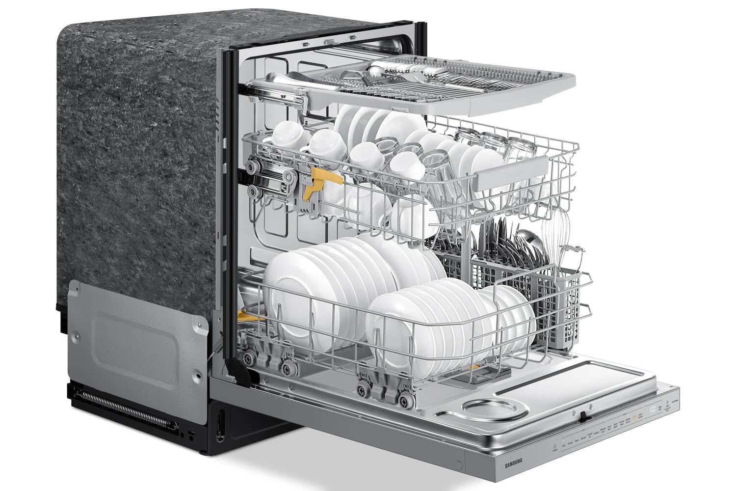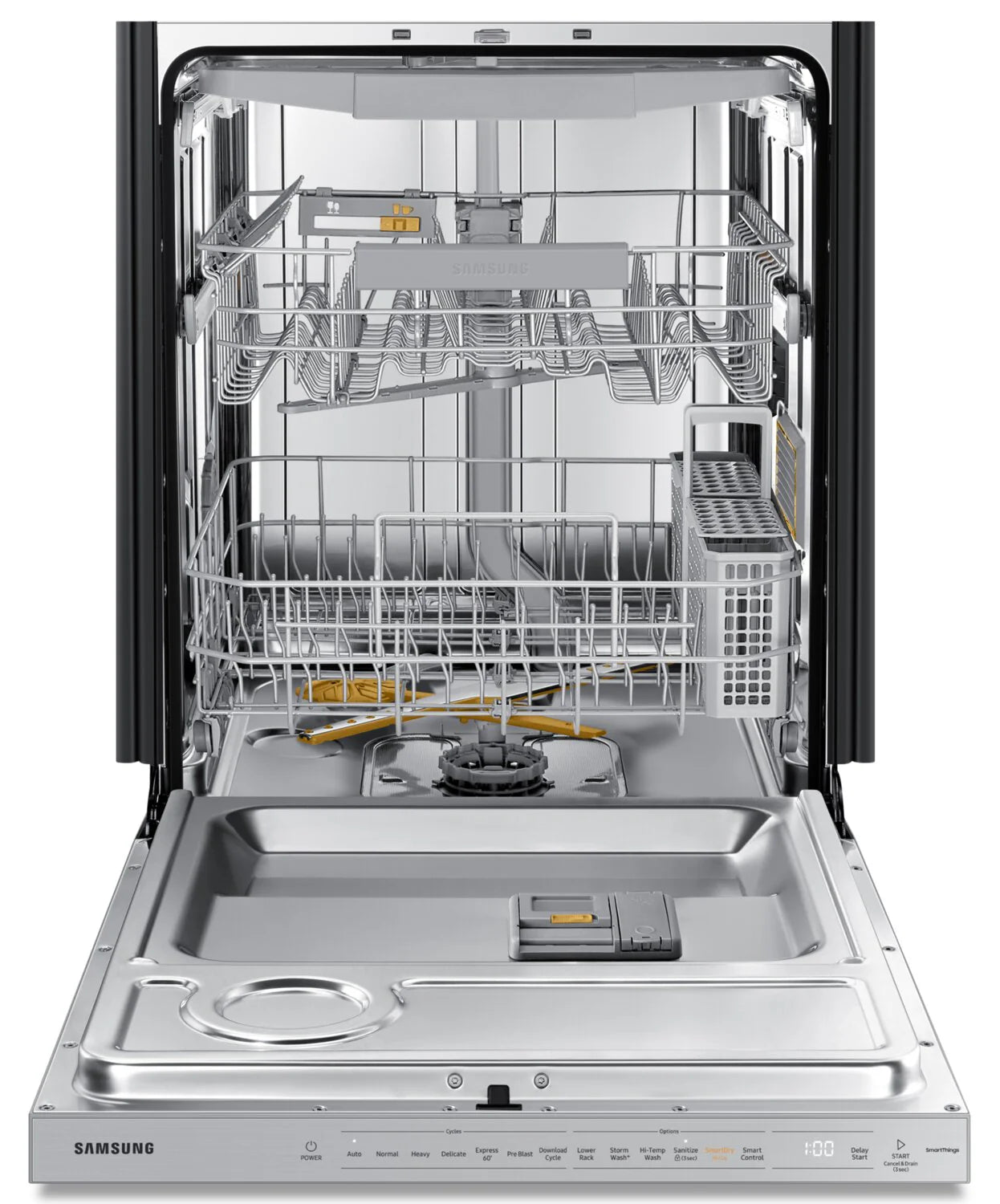 FlexLoad™ Rack System: Fit items easily by adjusting the height of the middle rack. Reconfigure the lower rack to fit large cookware and move the cutlery basket around to free up space as needed.