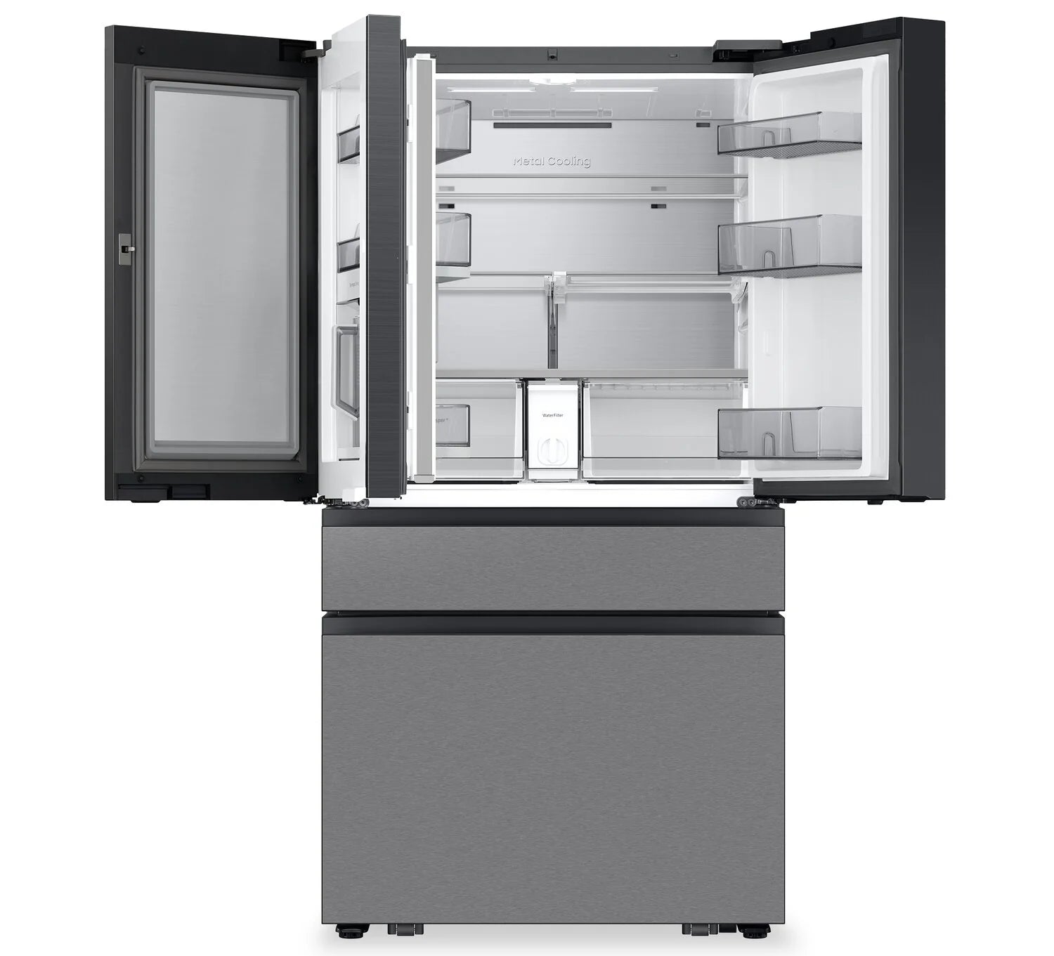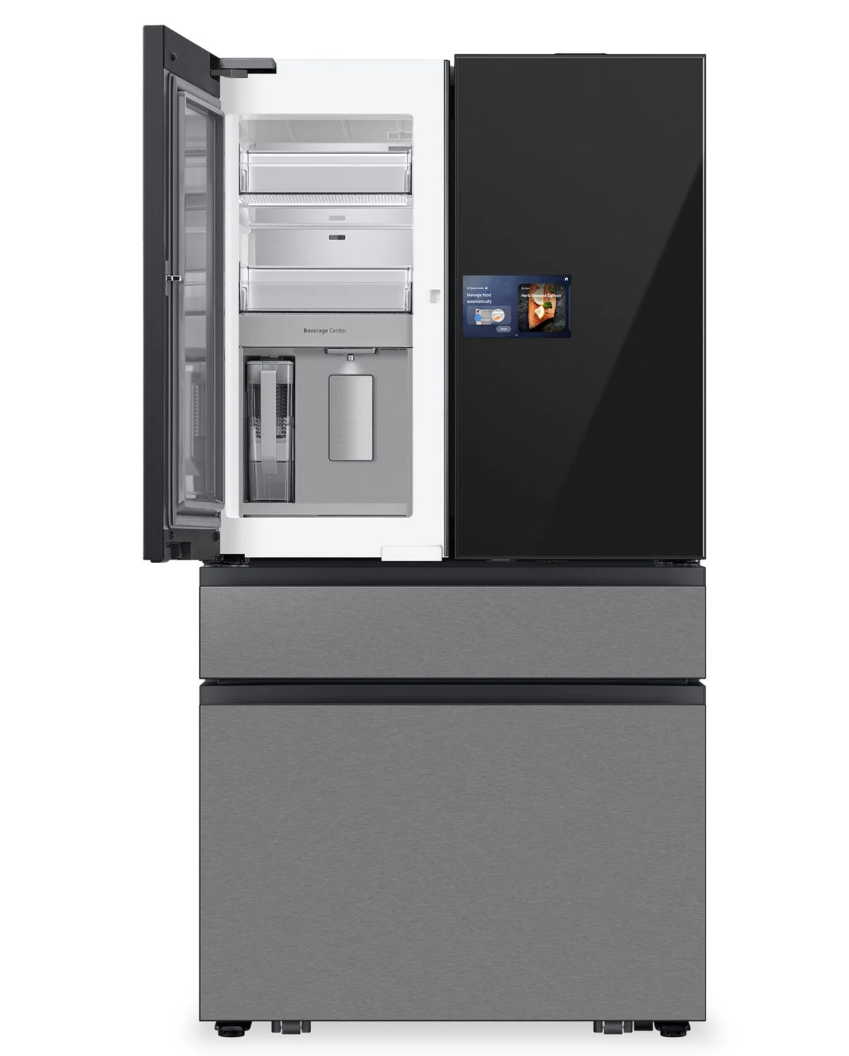 Featuring style, smart technology and cooling features galore, this Samsung Bespoke refrigerator is the whole package. The AI Home Screen provides control right at your fingertips. Plus, AI Vision Inside uses an internal camera to keep track of your food for grocery day. The built-in Beverage Centre with AutoFill Water Pitcher provides a fresh drink anytime that can be infused with fruits or herbs. Even more, the FlexZoneâ„¢ lets you select the ideal temperature for meat, wine and more. With customizable door panels that can be swapped out to suit your style, this refrigerator wows both inside and out.