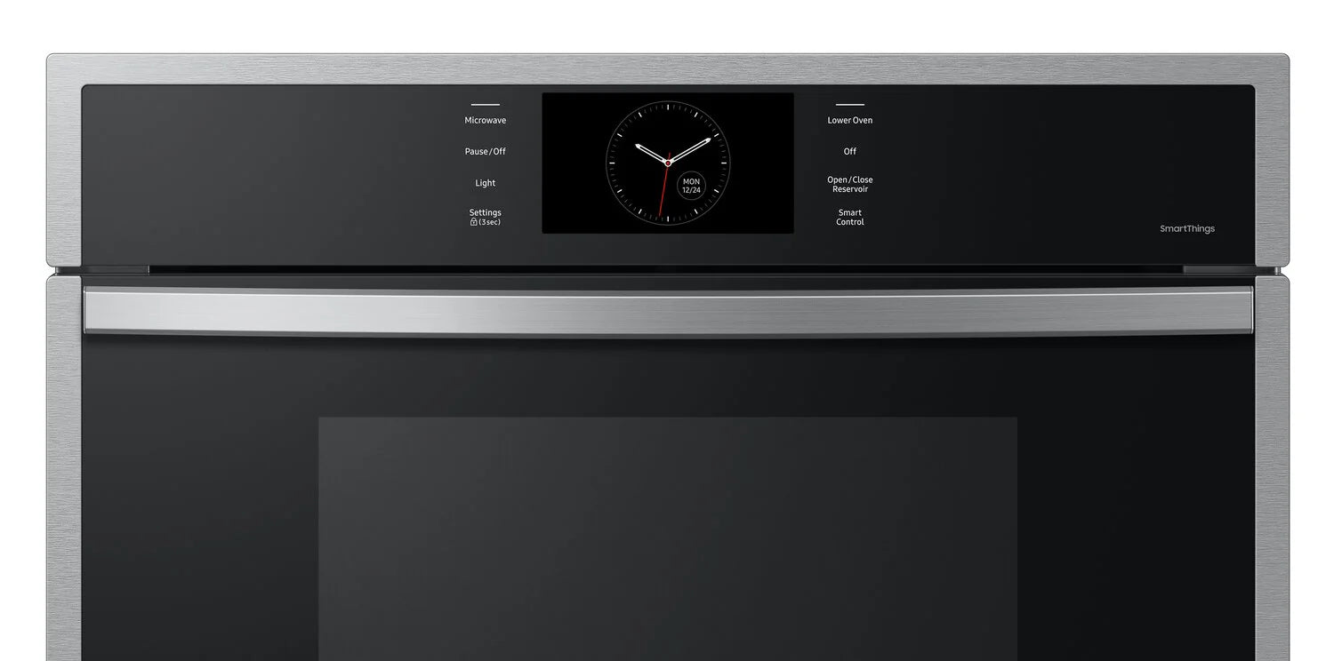 Become the culinary master of your domain with this Samsung combination wall oven. A convection system in the microwave allows you to reheat meals in less time. In the oven, Air Fry technology provides healthier versions of your favourite fried foods with the same great taste. Dual Convection ensures consistent temperatures throughout the cooking space, while Steam Cook uses moisture to enhance flavour and texture. A large LCD display provides sleek style to this appliance – plus, smart capabilities offer ultimate convenience by letting you take control right from your smartphone.