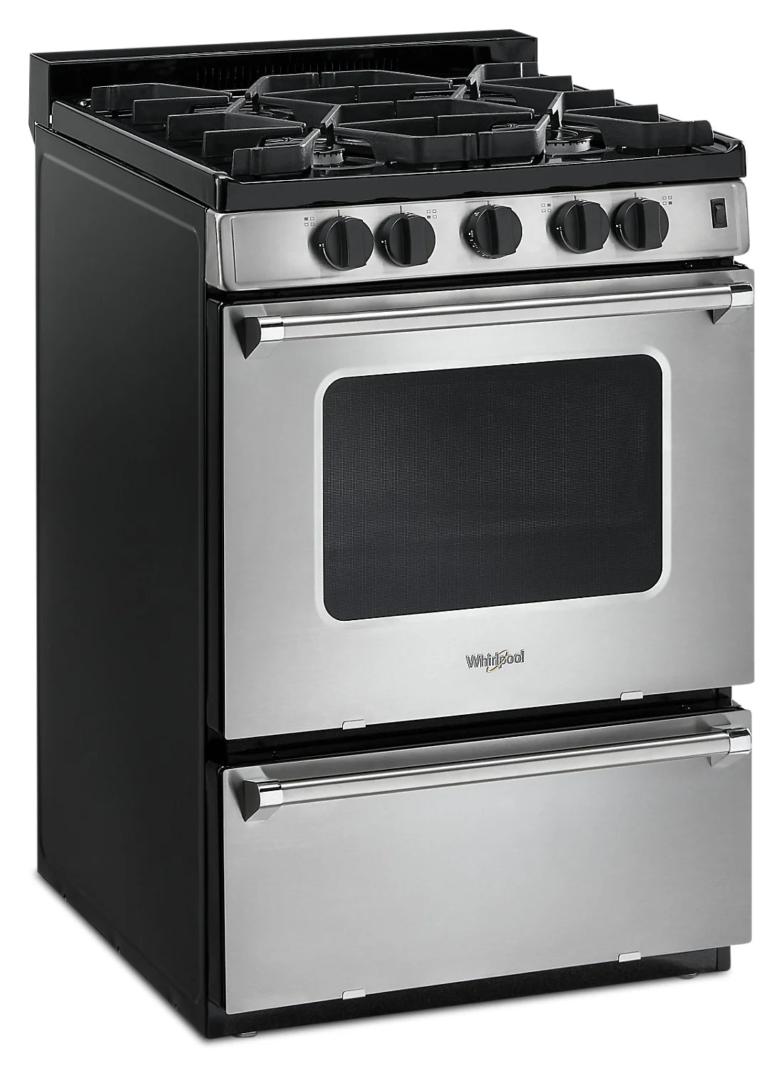 Serve up something for everyone, even in tight kitchens, with this 24-inch Whirlpool freestanding gas range. This ADA-compliant stove gives you more control and flexibility with burners designed to provide low heat for simmering or high heat for quick searing and boiling. Plus, easily keep an eye on what’s cooking through the large oven window. When dinner is done, cut down on cleanup time with sealed burners that prevent spills from seeping into those hard-to-reach corners, and durable dishwasher-safe cast-iron grates.