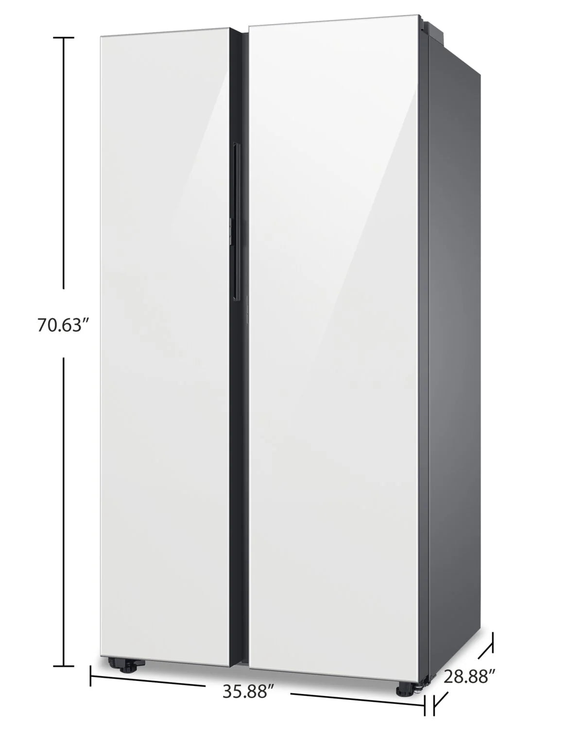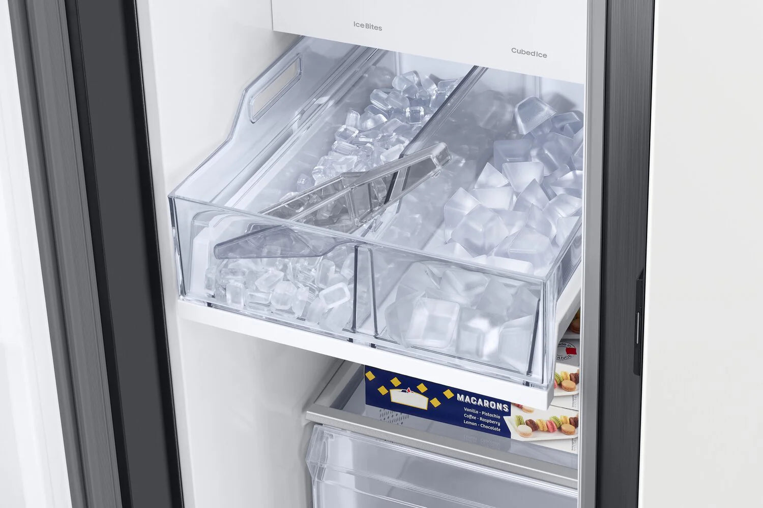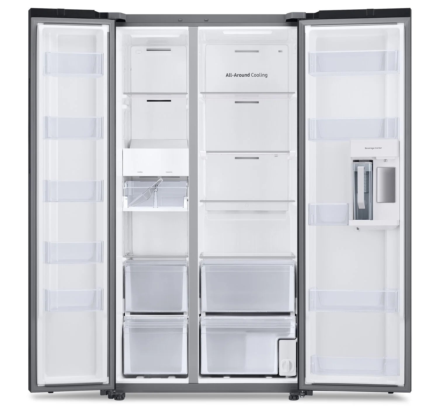 Auto Open Doors: Both doors feature sensors that open easily by releasing the seal when you touch them. Plus, they make a sound to alert you as they open and will close automatically if not opened further after two seconds. Beverage Centre: Get quick access to refreshingly cool, filtered water two ways – refill using either the internal dispenser or the built-in pitcher that fills automatically and features the option to infuse with a flavour. Dual Auto Ice Maker: Enjoy your favourite beverage with either cubed ice or Ice Bites that chill your drink faster. SpaceMax™ Technology: Store more food in the spacious 22.6-cubic-foot interior. Unique SpaceMax technology enables the walls to be thin, creating extra storage space without increasing the fridge’s external dimensions. Slide-In Shelf: The slide-in shelf can be slid back to create more room for storing and organizing tall items. Power Cool and Power Freeze: Power Cool and Power Freeze deliver fast blasts of cold air into both compartments to cool groceries and firm up frozen food. All-Around Cooling: All-Around Cooling continually checks the temperature and circulates cool air through strategically placed vents, so food is kept at the optimum temperature. Smart Technology: Monitor and manage the fridge’s performance from your smartphone using the SmartThings app. Control the Rapid Cooling modes, change the temperature and get alerts if the door is left open. You can also monitor its energy consumption and diagnose any issues. ENERGY STAR® Certified: Energy Star certified appliances help you save money by using less energy without sacrificing performance or functionality. |