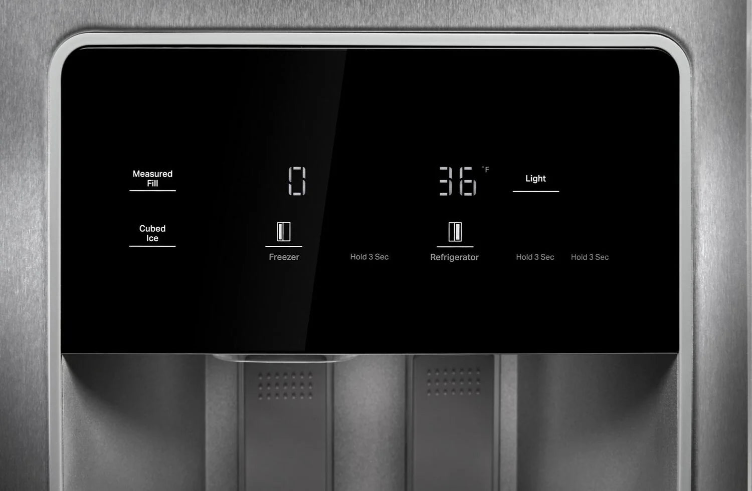 Featuring in-door ice and water, the ice bin is relocated to the door, freeing up an extra full shelf for more storage.