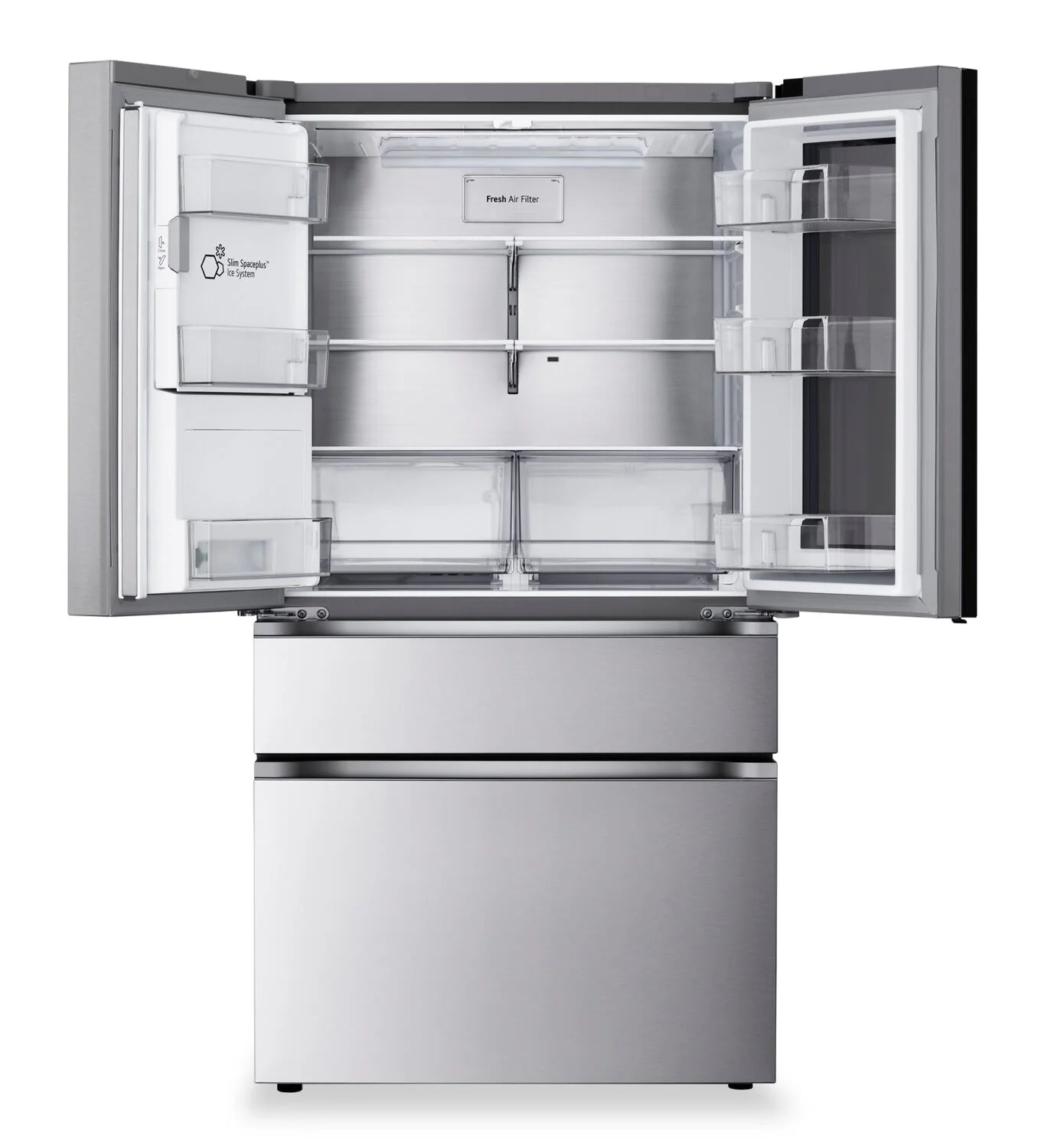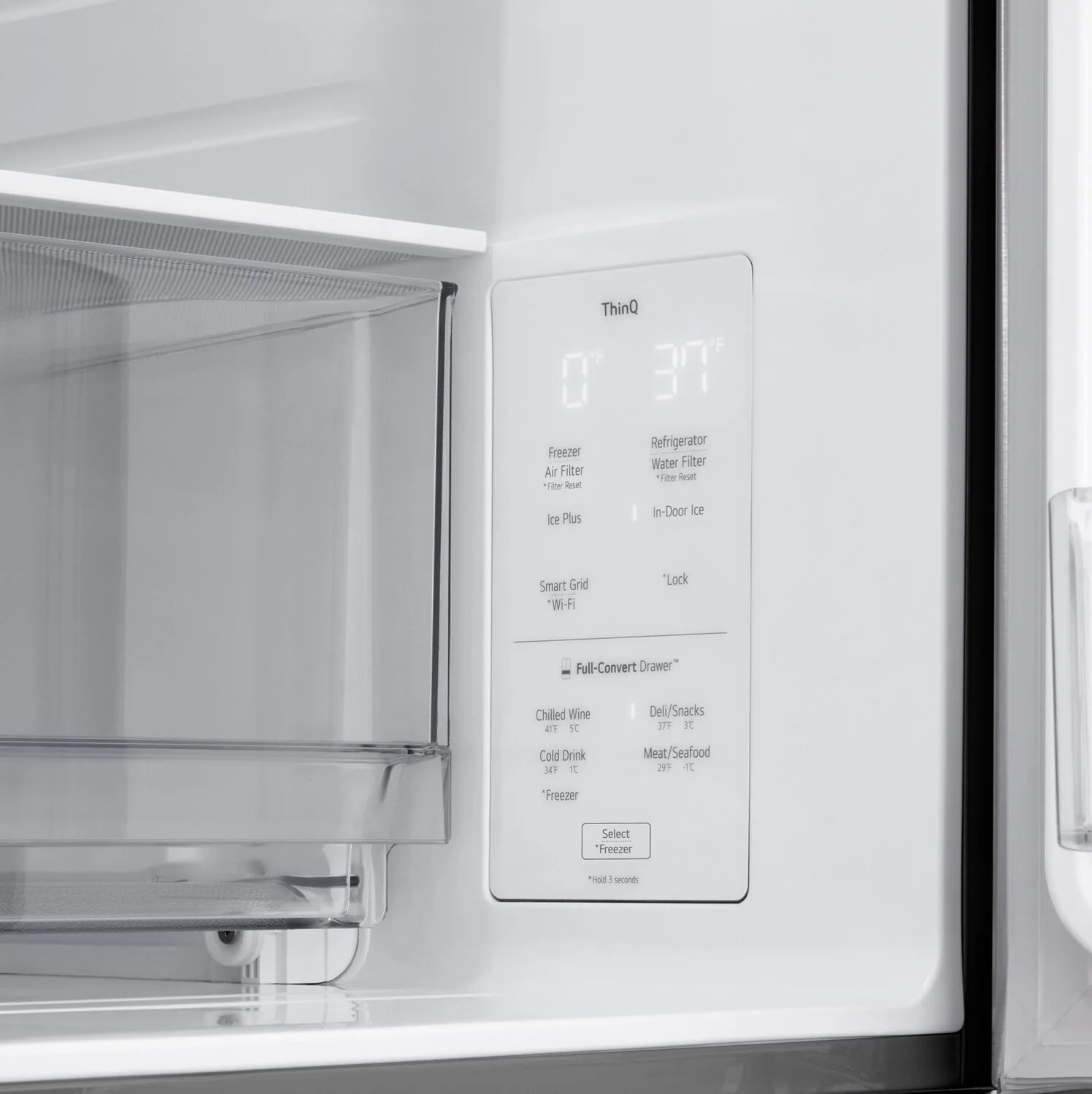 Make a Design Statement with MyColor: MAX out your style by changing the colour of the InstaView window’s interior LED lighting to complement your kitchen and lifestyle. Choose from five vibrant colour options through the ThinQ® app. See Inside and Keep Your Cool: The LG InstaView Door-in-Door has a tinted glass panel that illuminates with two quick knocks, allowing you to see inside the easy access compartment without ever opening the door. This reduces cold air loss and helps keep your food fresher longer. Slam No More: Soft-close hinges catch the door to allow it to close softly and quietly and keep it from slamming shut. Not only does it keep the peace in your kitchen, but it also protects little hands that may be searching for an afternoon snack. Store More: Take advantage of all the space – 29 cubic feet to be exact. This LG French-door refrigerator’s wide-open shelves keep all your family's favourites stored and organized. More Ice When You Need It: Turn on IcePlus™ to kick ice production into high gear by automatically lowering freezer temperatures to the coldest setting for 24 hours. ThinQ Makes Life Happen: The ThinQ app offers control and convenience to help you simplify life and enjoy the comforts of home. Control your refrigerator remotely or use voice commands with Google or Alexa voice assistants. Plus, change the interior colour of your InstaView window, track energy and filter usage and access Smart Diagnosis, customer support and more. Full-Convert Drawer: Choose from five temperature settings to create optimal storage for wine, deli items, cold drinks, meats and seafood, or frozen favourites. Plus, enjoy the flexibility to convert the drawer from fridge to freezer and back again with just a touch. Tall Ice and Water Dispenser: From pitchers to pint glasses, finally an ice and water dispenser that can accommodate just about any container. The water and ice dispenser in this LG French-door refrigerator is one of the tallest around, measuring in at an ultra-accommodating 12.6 inches. ThinQ Care™ Helps Keep Your Appliances Running Smoothly: Available within the ThinQ app, ThinQ Care sends proactive usage, maintenance and diagnostic alerts to your smartphone to help keep your LG smart appliances running smoothly. |