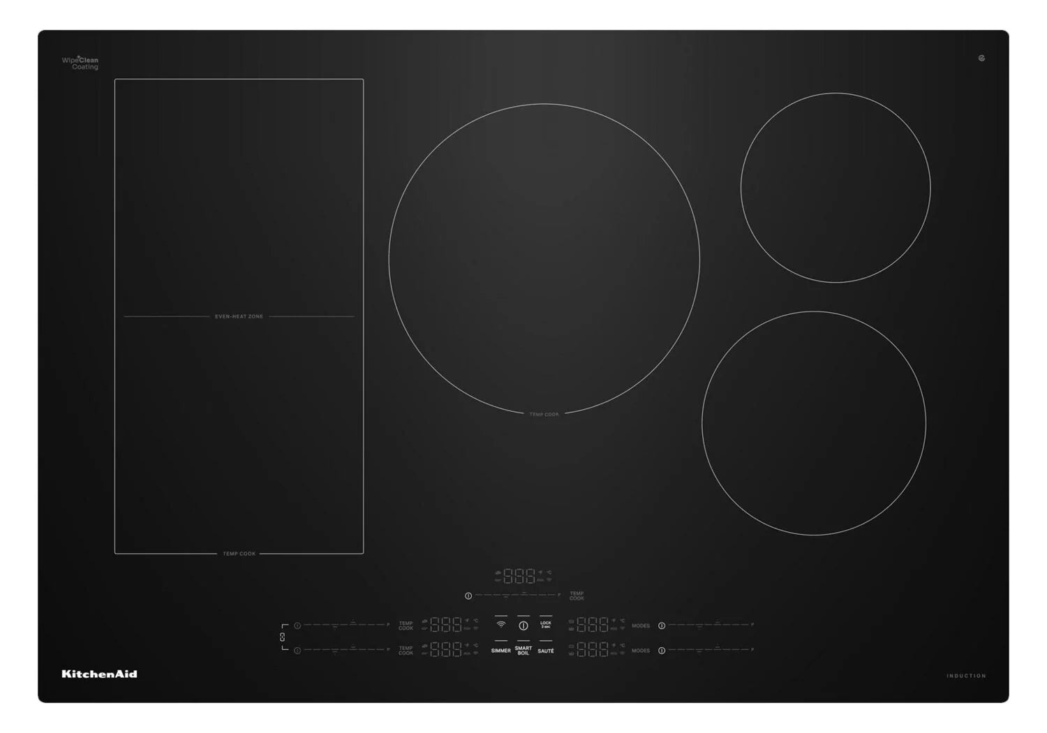This 30" induction cooktop from KitchenAid helps you take on cooking adventures of all kinds with delicious results every time. Temp Cook™ induction technology maintains the temperature you set for precision beyond high, medium and low settings, while Temp Cook™ smart presets help you perfectly sear salmon, gently simmer sauces, quickly boil water and more. Plus, the Even-Heat™ zone adds versatility to cook with large pans like griddles or two pans at once. Enjoy reliable, adaptable cooking with this sleek cooktop.